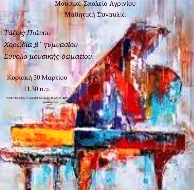 Το Μουσικό Σχολείο Αγρινίου διοργανώνει μαθητική συναυλία με έργα για πιάνο την Κυριακή 30 Μαρτίου 2025 και ώρα 11:30 στην αίθουσα εκδηλώσεων του Σχολείου.