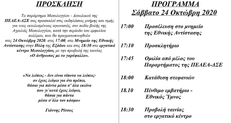 Μεσολόγγι: Εκδηλώσεις ΠΕΑΕΑ-ΣΔΕ το Σάββατο 24 Οκτωβρίου