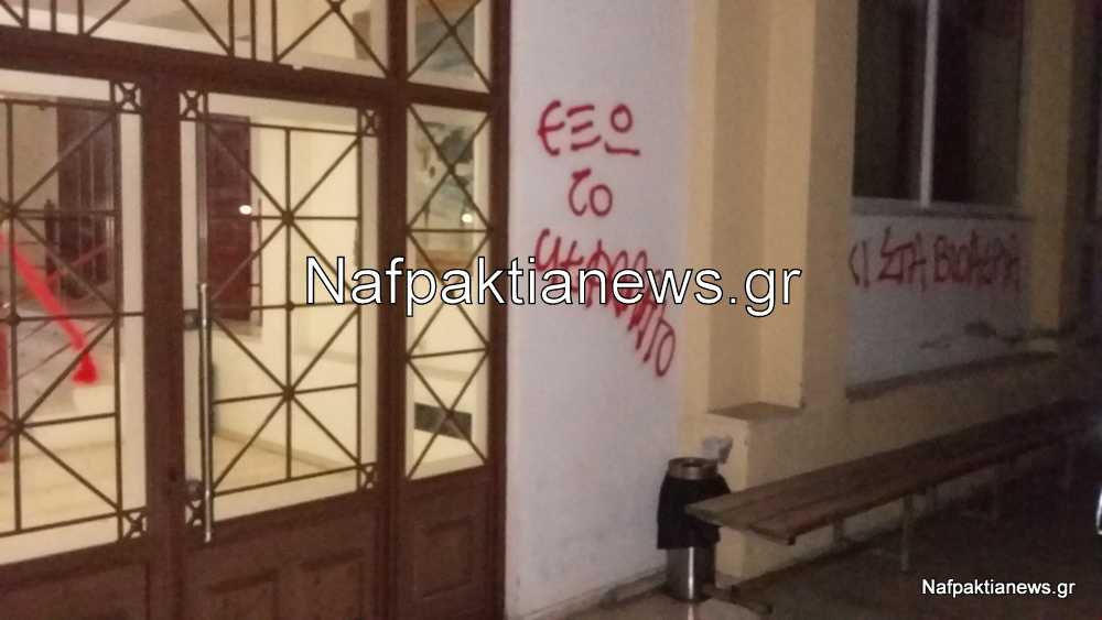 Άγνωστοι έγραψαν με σπρέι στους τοίχους στο κτίριο της πρώην νομαρχίας στο Μεσολόγγι και έριξαν σκουπίδια στην είσοδο – Δεν έγιναν αντιληπτοί από κανέναν.