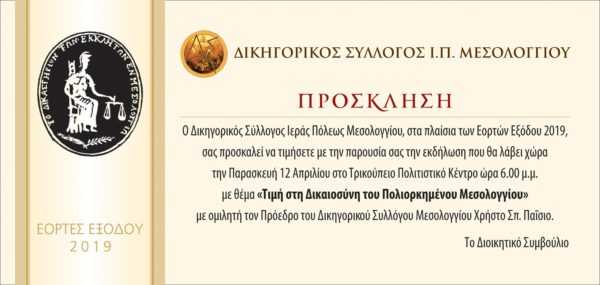 6.00 μ.μ. «Τιμή στη Δικαιοσύνη του Πολιορκημένου Μεσολογγίου» – Ομιλία από τον κ. Χρήστο Παϊσιο, Πρόεδρο του Δικηγορικού Συλλόγου Μεσολογγίου. – Τρικούπειο Πολιτιστικό Κέντρο Συνδιοργάνωση: Πνευματικό Κέντρο