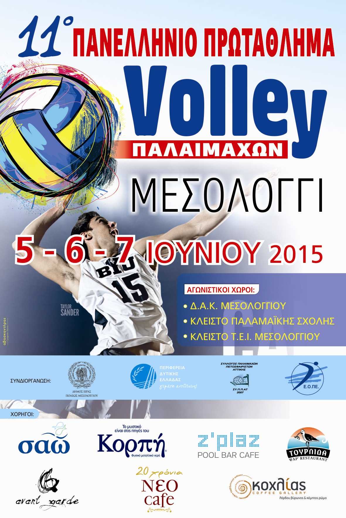 Ο Δήμος Ι.Π. Μεσολογγίου και το Πνευματικό Κέντρο, σε συνεργασία με την Ελληνική Ομοσπονδία Πετοσφαίρισης , το Σύλλογο Παλαιμάχων Πετοσφαιριστών Αττικής καθώς και την Περιφέρεια Δυτικής Ελλάδας, συνδιοργανώνουν το 11ο Πανελλήνιο Πρωτάθλημα Volley Παλαιμάχων, που θα διεξαχθεί από 5 έως 7 Ιουνίου στο Μεσολόγγι.