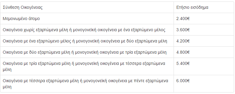 Α. Άτομα και οικογένειες των οποίων το πραγματικό εισόδημα δεν υπερβαίνει ετησίως το ποσό των 2.400 € για μεμονωμένο άτομο και των 3.600€ για το ζευγάρι ή για το μεμονωμένο άτομο με ένα εξαρτώμενο μέλος (ανήλικο ή προστατευόμενο τέκνο), προσαυξανόμενο κατά 600 € για κάθε περαιτέρω εξαρτώμενο μέλος (ανήλικο ή προστατευόμενο τέκνο) της οικογένειας. Στη μονογονεϊκή οικογένεια (οικογένεια που προστατεύεται από έναν μόνο γονέα, άγαμο, σε χηρεία ή διαζευγμένο ή μετά από καταγγελία του συμφώνου συμβίωσης) το πρώτο εξαρτώμενο ανήλικο μέλος λογίζεται ως ενήλικας. Ενδεικτικά παρατίθεται ο παρακάτω πίνακας:
