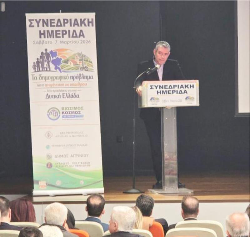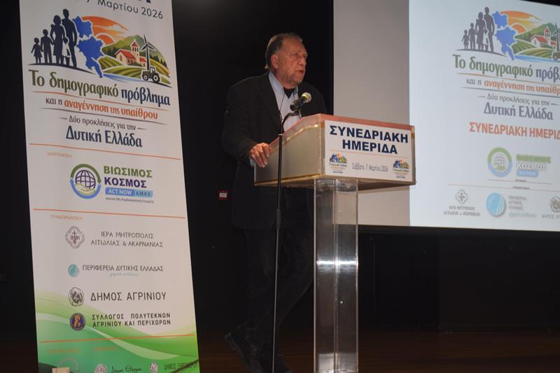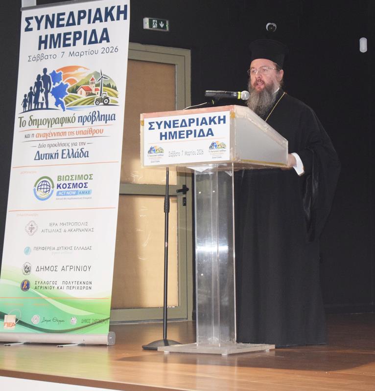Με πρωτοβουλία της Αστικής Μη Κερδοσκοπικής Εταιρείας «Βιώσιμος Κόσμος» και με τη συνδιοργάνωση της Ιεράς Μητροπόλεως Αιτωλίας και Ακαρνανίας , του Δήμου Αγρινίου, του Συλλόγου Πολυτέκνων Αγρινίου και Περιχώρων, της Περιφέρειας Δυτικής Ελλάδας, της ΠΕΔ και τη στήριξη των Δήμων Θέρμου και Ξηρομέρου πραγματοποιήθηκε με απόλυτη επιτυχία, το Σάββατο 7 Μαρτίου 2026 στο Αγρίνιο μια ιδιαίτερα σημαντική συνεδριακή ημερίδα με θέμα: «Το Δημογραφικό Πρόβλημα και η Αναγέννηση της Υπαίθρου – Δύο Προκλήσεις για τη Δυτική Ελλάδα».