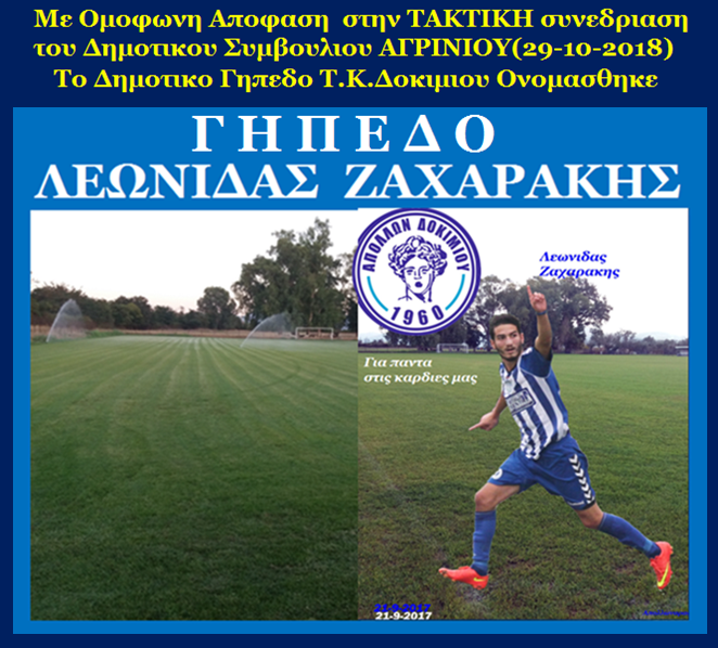 Το Δημοτικό Γήπεδο Τ.Κ. ΔΟΚΙΜΙΟΥ με Ομόφωνη απόφαση της ΤΑΚΤΙΚΗΣ συνεδρίασης του Δημοτικού Συμβουλίου ΑΓΡΙΝΙΟΥ (29-10-2018) ονομάστηκε Γήπεδο ΛΕΩΝΙΔΑΣ ΖΑΧΑΡΑΚΗΣ.