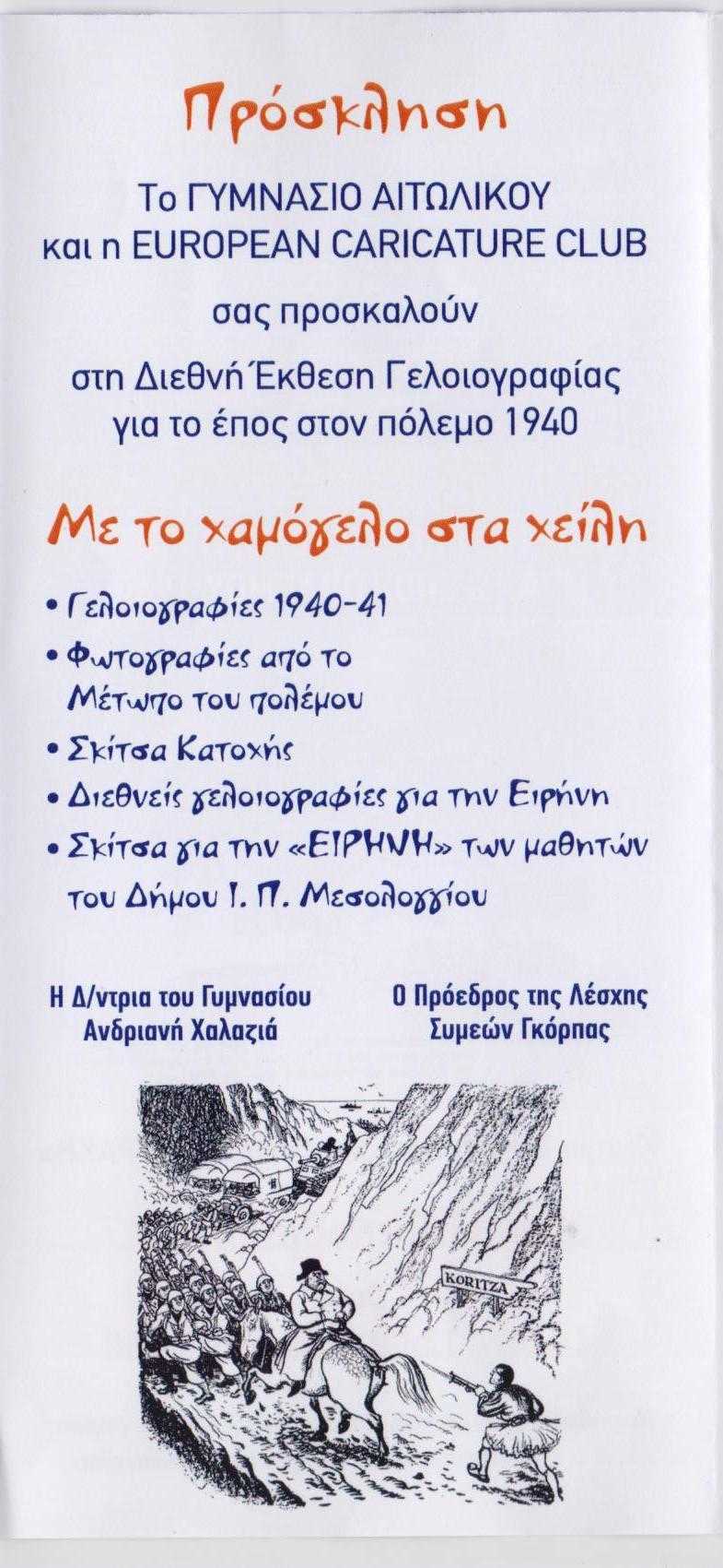 Γελοιογράφοι  1940: ΔΗΜΗΤΡΙΑΔΗΣ Φωκίων, ΜΠΕΖΟΣ Κώστας, ΠΟΛΕΝΑΚΗΣ Σταμάτης, ΠΑΥΛΙΔΗΣ Παύλος, ΚΑΣΤΑΝΑΚΗΣ Νίκος, ΒΛΑΣΣΟΠΟΥΛΟΣ Ανδρέας, ΑΝΤΩΝΙΑΔΗΣ Σοφοκλής, ΜΑΣΤΙΧΙΑΔΗΣ Φώτιος, ΘΕΟΔΩΡΙΔΗΣ Αντώνης, ΣΕΡΒΟΣ Ιάσων, ΜΑΡΚΟΠΟΥΛΟΣ Γλαύκος, ΘΕΟΦΑΝΟΠΟΥΛΟΣ Αντώνης. Γελοιογράφοι από όλο το κόσμο, πάλεψαν το ίδιο αποτελεσματικά στο επίπεδο της ψυχολογίας με τους μαχητές του πολεμικού μετώπου και ανέδειξαν το χαμόγελο ισότιμο συναγωνιστή του ηρωισμού των Ελλήνων. SMITH George (USA), KEM Brayan (BRITAIN), TANTI  Maurice MALTA, WALKER Timothy (CANADA) , HERIGEST Antony(BRITAIN), BEKES Ratzin (INDIA),  AKYOL Ercan (TURKEY)[…].