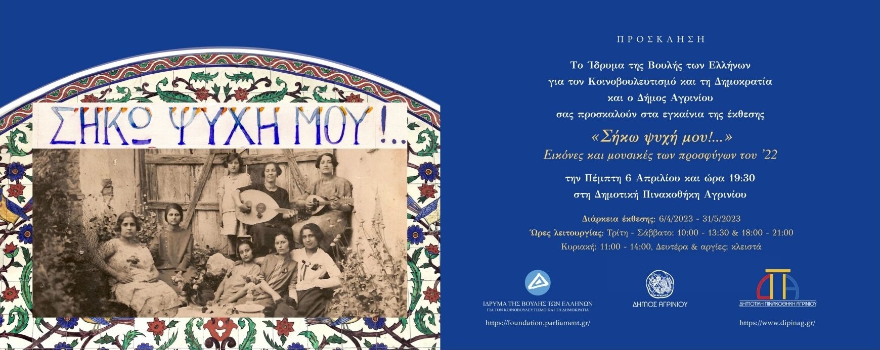 Το Ίδρυμα της Βουλής των Ελλήνων για τον Κοινοβουλευτισμό και τη Δημοκρατία και ο Δήμος Αγρινίου παρουσιάζουν την έκθεση «ΣΗΚΩ ΨΥΧΗ ΜΟΥ»!… Εικόνες και μουσικές των προσφύγων του ’22, στο πλαίσιο των εκδηλώσεων μνήμης για τα 100 χρόνια από τη Μικρασιατική Καταστροφή.