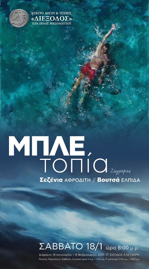 Δύο καταξιωμένες σύγχρονες καλλιτέχνιδες, η Αφροδίτη Σεζένια και η Ελπίδα Βουτσά, εγκαινιάζουν για τον νέο χρόνο τις εικαστικές δραστηριότητες της «Διεξόδου» με μία κοινή τους έκθεση ζωγραφικής που φέρει τον τίτλο «Μπλέ τοπία» αφού σε όλα σχεδόν τα έργα τους κυριαρχεί το χρώμα της θάλασσας και του ορίζοντα.
