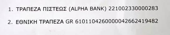 Για όποιον θέλει να βοηθήσει, ακολουθούν δυο τραπεζικοί λογαριασμοί όπου μπορεί να προσφέρει το όποιο χρηματικό ποσό.