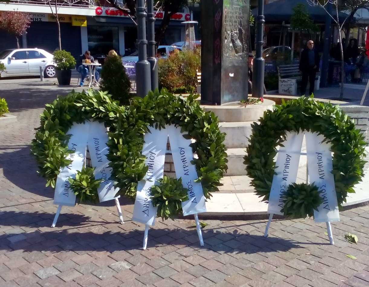 Στεφάνια από το Δήμο Αγρινίου στην πλατεία Δημοκρατίας στη μνήμη των εκτελεσθέντων και των απαγχονισθέντων του 1944.