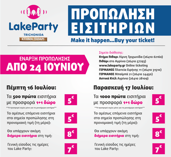 Φέτος το Lake Party Trichonida ξαναχτυπά και ετοιμάζεται να απογειωθεί με μια διοργάνωση πολλά υποσχόμενη. Μεγάλα ονόματα από το χώρο της μουσικής, θα βρίσκονται κοντά μας δίνοντας ο καθένας με τον δικό του μοναδικό τρόπο, ένταση και ρυθμό.