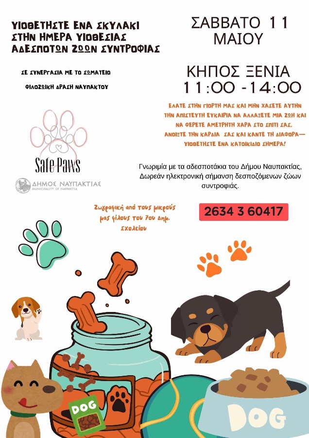 Ο Δήμος Ναυπακτίας σε συνεργασία με το Σωματείο «Φιλοζωϊκή Δράση Ναυπάκτου» διοργανώνουν Ημέρα Υιοθεσίας Αδέσποτων Ζώων Συντροφιάς, το Σάββατο 11 Μαΐου, από τις 11:00 έως τις 14:00’, στον Κήπο Ξενία.
