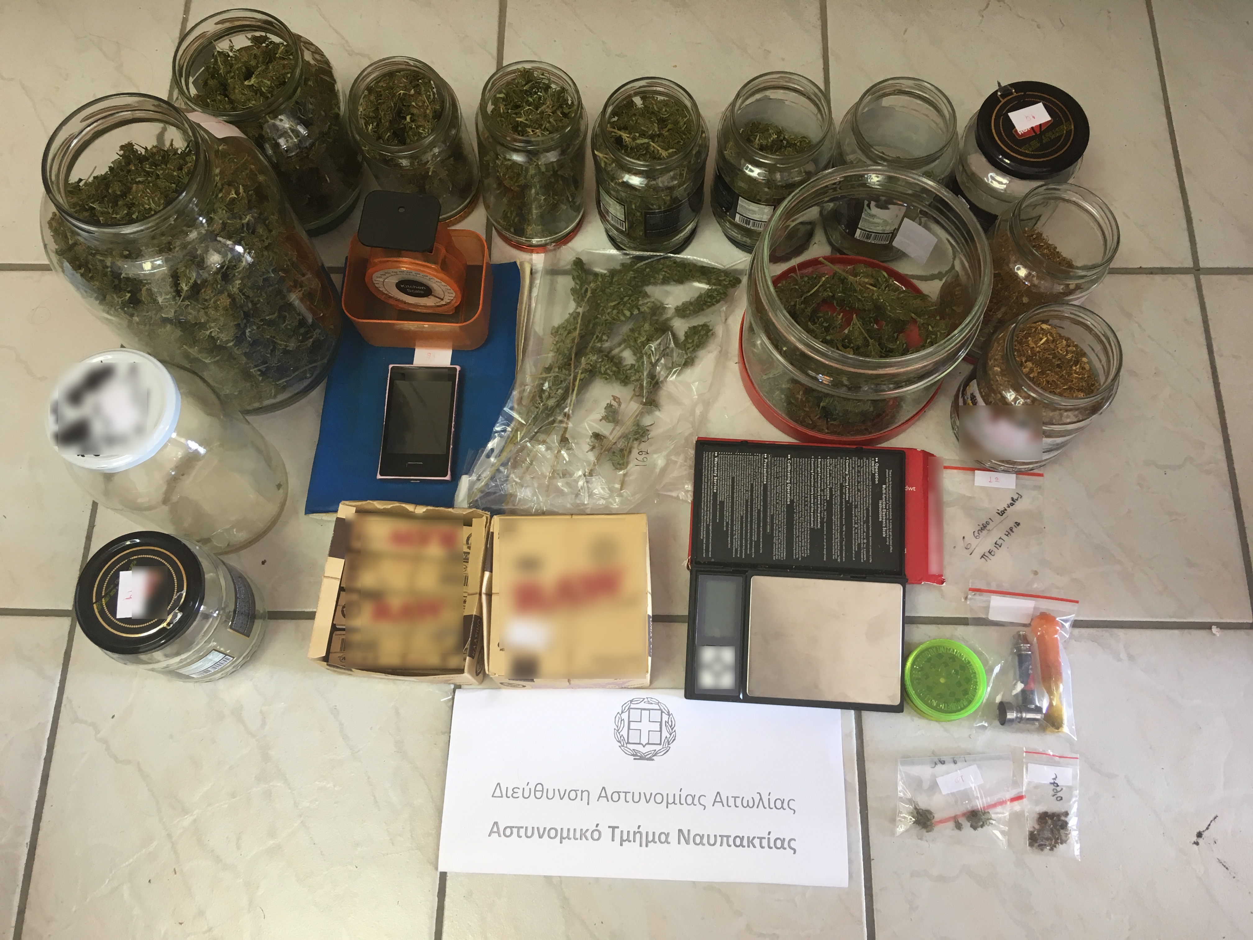 Τα ναρκωτικά ήταν διαμοιρασμένα σε γυάλινα βάζα, ενώ επιπλέον κατασχέθηκαν περισσότερα από 100 γραμμάρια λαθραίου καπνού, σπόροι κάνναβης και δυο ζυγαριές.