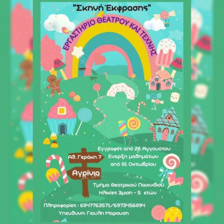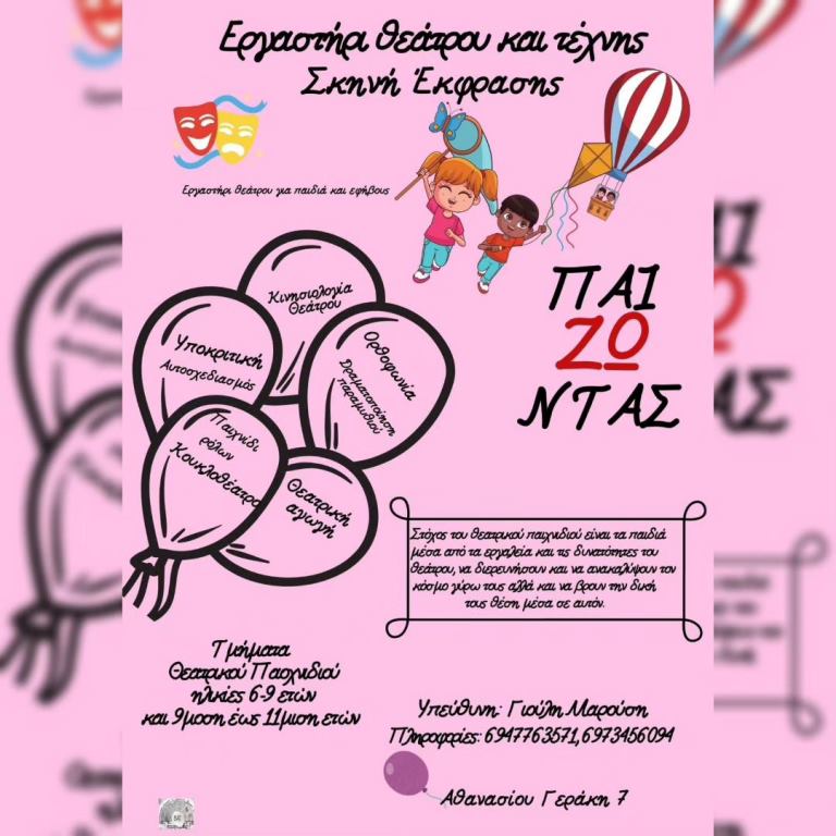 Στο εργαστήριο μας οι τέχνες, τα παραμύθια, η ζωγραφική, η γλυπτική, η αρχιτεκτονική, η ποίηση και κάθε λογής ιστορίες παίζουν θέατρο! Θεατρικό και συμβολικό παιχνίδι, παιχνίδια ρόλων, σκηνικός αυτοσχεδιασμός, ψυχοκινητικά παιχνίδια, παρατηρητικότητα, λόγος, παιχνίδια μεταμορφώσεων και σύντομων αφηγήσεων, αποτελούν εργαλεία και φόρμες του μαθήματος, και δημιουργούν το κατάλληλο περιβάλλον απελευθερωμένης έκφρασης, επικοινωνίας και δράσης για τους μικρούς συμμετέχοντες.