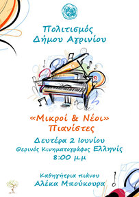 Την Κυριακή 25 Μαΐου 2025 οι μικροί πιανίστες του Δήμου Αγρινίου συμμετέχουν στην τελετή λήξης της σχολικής χρονιάς των μαθημάτων πιάνου στις 7:30μ.μ. υπό την καθοδήγηση της υπεύθυνης καθηγήτριας κ.Βιβή Κανιούρη