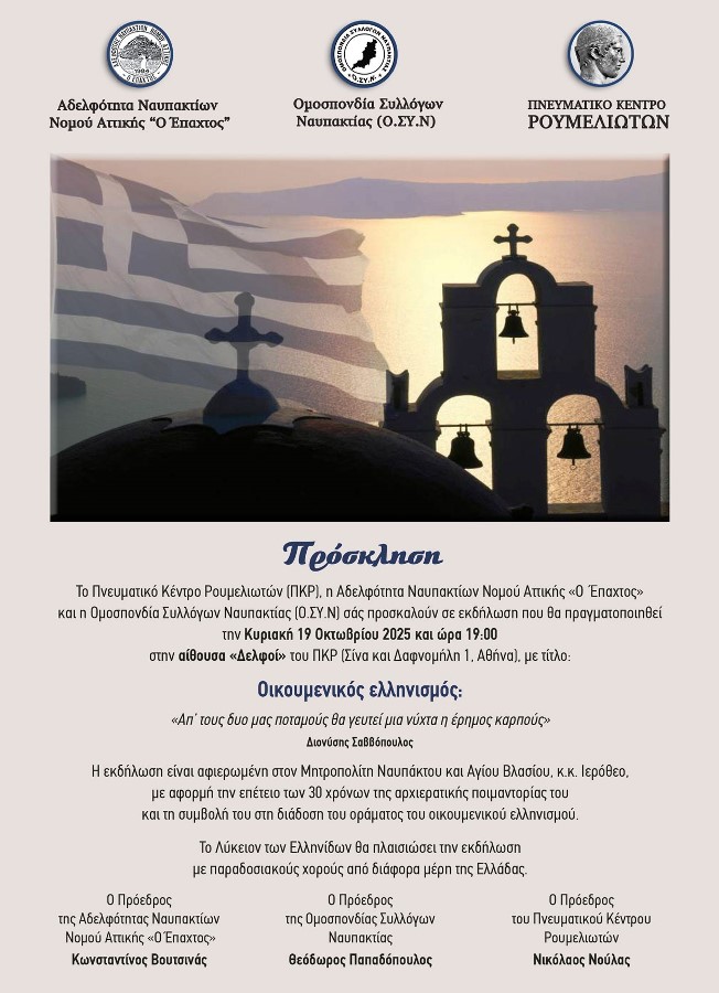 Το Πνευματικό Κέντρο Ρουμελιωτών (ΠΚΡ), η Αδελφότητα Ναυπακτίων Νομού Αττικής «Ο Έπαχτος» και η Ομοσπονδία Συλλόγων Ναυπακτίας (Ο.ΣΥ.Ν.) συνδιοργανώνουν εκδήλωση που θα πραγματοποιηθεί την Κυριακή 19 Οκτωβρίου 2025 και ώρα 19:00 στην αίθουσα «Δελφοί» του ΠΚΡ (Σίνα και Δαφνομήλη 1, Αθήνα), με τίτλο: Οικουμενικός ελληνισμός: «Απ’ τους δυο μας ποταμούς θα γευτεί μια νύχτα η έρημος καρπούς» Διονύσης Σαββόπουλος.