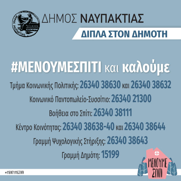 Ακολούθως τα τηλέφωνα επικοινωνίας των κοινωνικών δομών και υπηρεσιών του Δήμου Ναυπακτίας: