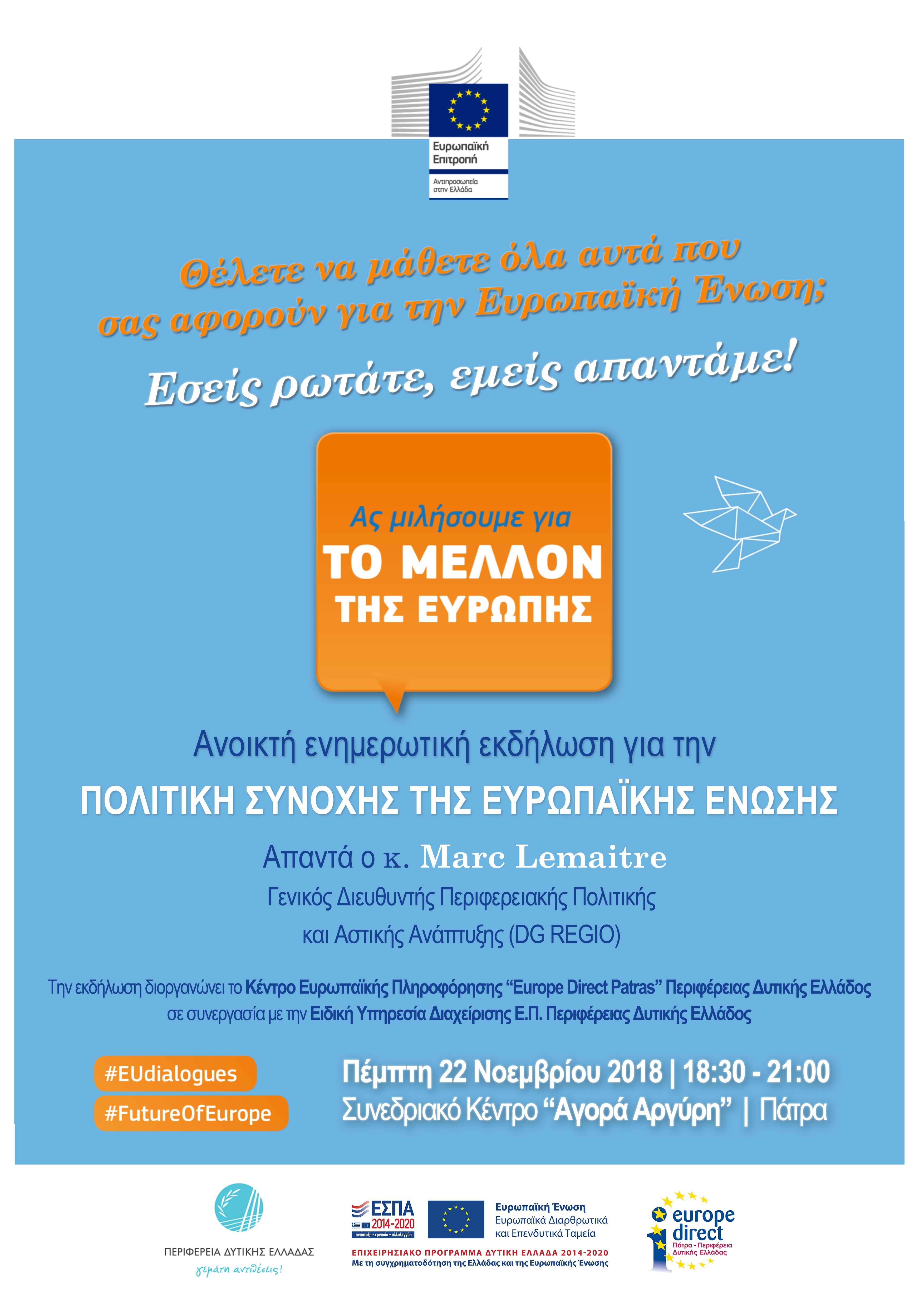Η Πολιτική Συνοχής της Ευρωπαϊκής Ένωσης είναι το κεντρικό θέμα ενημερωτικής εκδήλωσης που οργανώνει το Κέντρο Ευρωπαϊκής Πληροφόρησης «Europe Direct Patras» της Περιφέρειας Δυτικής Ελλάδας, σε συνεργασία με την Ειδική Υπηρεσία Διαχείρισης Επιχειρησιακού Προγράμματος Περιφέρειας Δυτικής Ελλάδας 2014-2020. Θα πραγματοποιηθεί στην Πάτρα, την Πέμπτη 22 Νοεμβρίου 2018, στο Συνεδριακό Κέντρο της Αγοράς Αργύρη και ώρα 18:30 – 21:00.