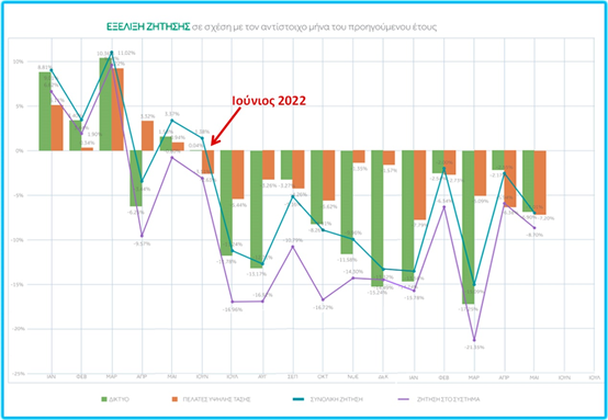 Σύμφωνα με τα στοιχεία που ανακοίνωσε ο ΑΔΜΗΕ για το Μάιο 2023, η ζήτηση ηλεκτρισμού παρουσίασε για ένα ακόμα μήνα μείωση σε σχέση με τον αντίστοιχο μήνα του προηγούμενου έτους. Το πιο πάνω διάγραμμα μας δείχνει πως ο Μάιος 2023 είναι ο 12ος συνεχόμενος μήνας που η ζήτηση ηλεκτρισμού είναι μειωμένη. Η μείωση αφορά τόσο τη χαμηλή τάση, δηλαδή νοικοκυριά και μικρές επιχειρήσεις, όσο και την υψηλή τάση, δηλαδή τη βιομηχανία.