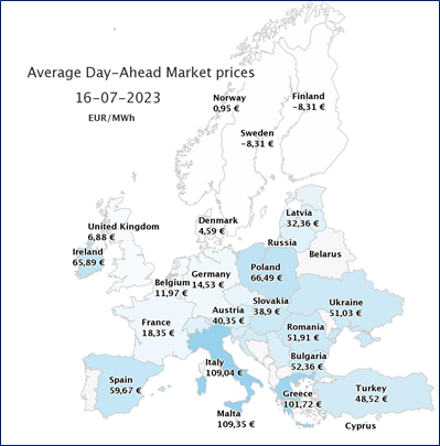 Ο μύθος λέει πως αν βάλουμε πολλά αιολικά+φωτοβολταϊκά θα έχουμε φθηνό ρεύμα. Στην πραγματικότητα ισχύει ακριβώς το αντίθετο! Όπως φαίνεται στο χάρτη, (που δημοσίευσε η Ρυθμιστική Ενέργειας), την Κυριακή 16/7 η Ελλάδα είχε τη 2η πιο τιμή ακριβή ρεύματος στην Ευρώπη, στη χονδρική αγορά. Τη Δευτέρα 17/7 την 3η πιο ακριβή, παρόλο που έχουμε ήδη σε λειτουργία πάνω από 10.000MW αιολικά+φωτοβολταϊκά. Μάλιστα η τιμή είναι διπλάσια ή υπερδιπλάσια απ’ τις γειτονικές χώρες. Η ακριβή τιμή χονδρικής σύντομα θα φθάσει στη λιανική, εξοντώνοντας νοικοκυριά και επιχειρήσεις: πώς θα ανταγωνιστεί π.χ. ο Ελληνικός τουρισμός την απέναντι ακτή του Αιγαίου;