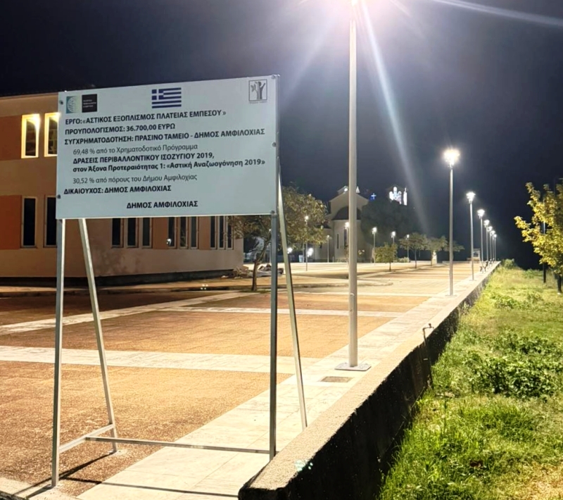 Ολοκληρώθηκε η υλοποίηση του έργου «Αστικός εξοπλισμός πλατείας Εμπεσού» που είχε ενταχθεί στο χρηματοδοτικό πρόγραμμα του Πράσινου Ταμείου «∆ράσεις Περιβαλλοντικού Ισοζυγίου 2019» από τον Δήμο Αμφιλοχίας για τον ηλεκτροφωτισμό της κεντρικής πλατείας του χωριού Εμπεσού.