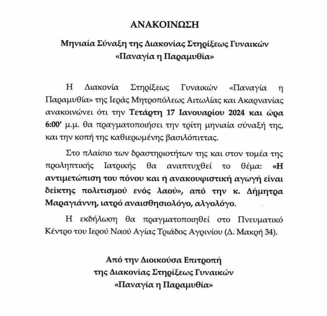 Ομιλία της ιατρού Δήμητρας Μαραγιάννη στην μηνιαία Σύναξη Διακονίας Στηρίξεως Γυναικών “Παναγία η Παραμυθιά”