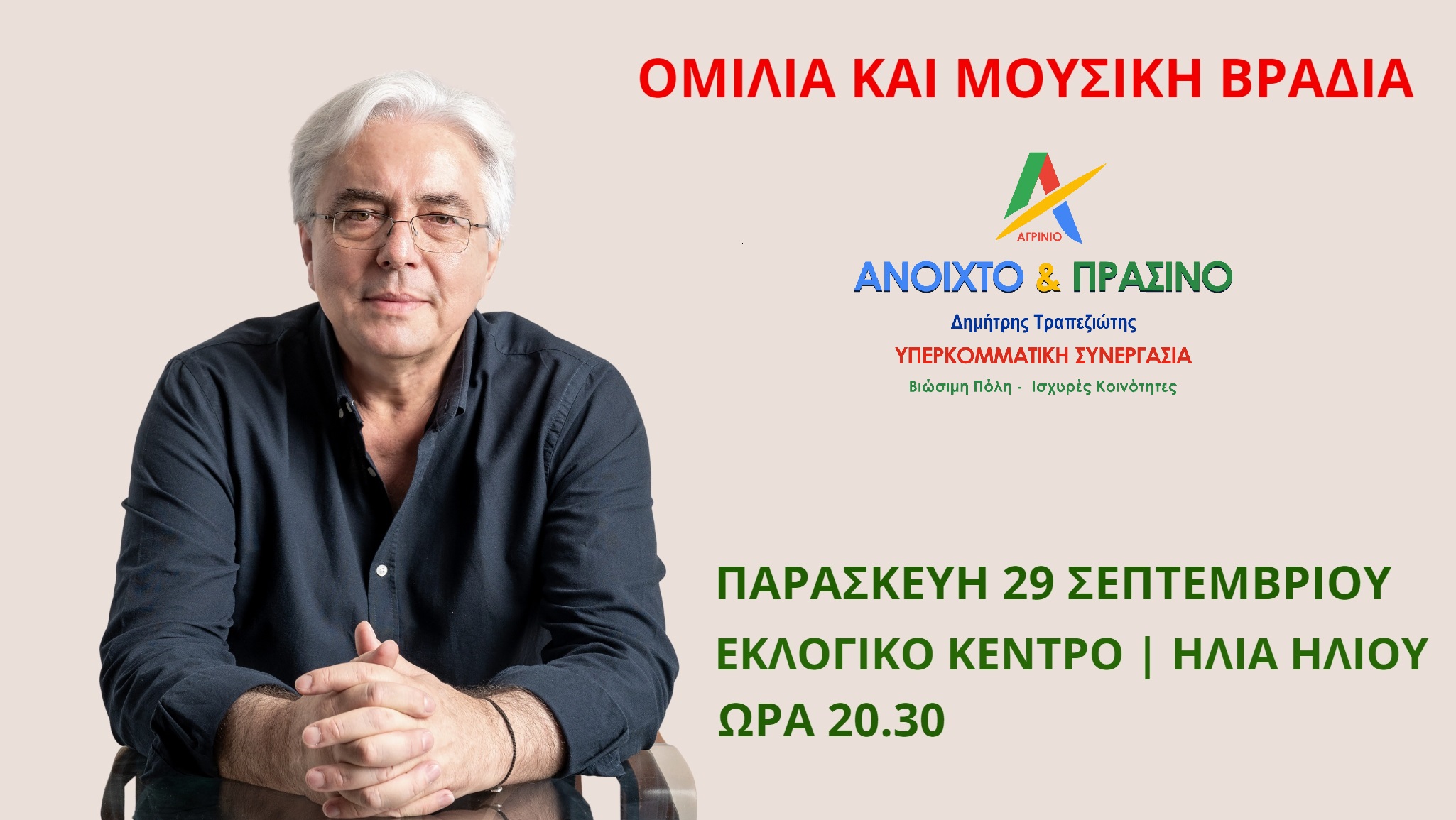 «Σας καλούμε όλες και όλους στην γιορτή του ΑΝΟΙΧΤΟΥ ΚΑΙ ΠΡΑΣΙΝΟΥ, όπου θα πραγματοποιήσει ομιλία ο υποψήφιος Δήμαρχος Αγρινίου, Δημήτρης Τραπεζιώτης και θα ακολουθήσει μουσική βραδιά από μουσικό σχήμα της πόλης μας.