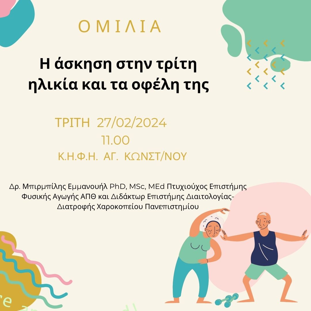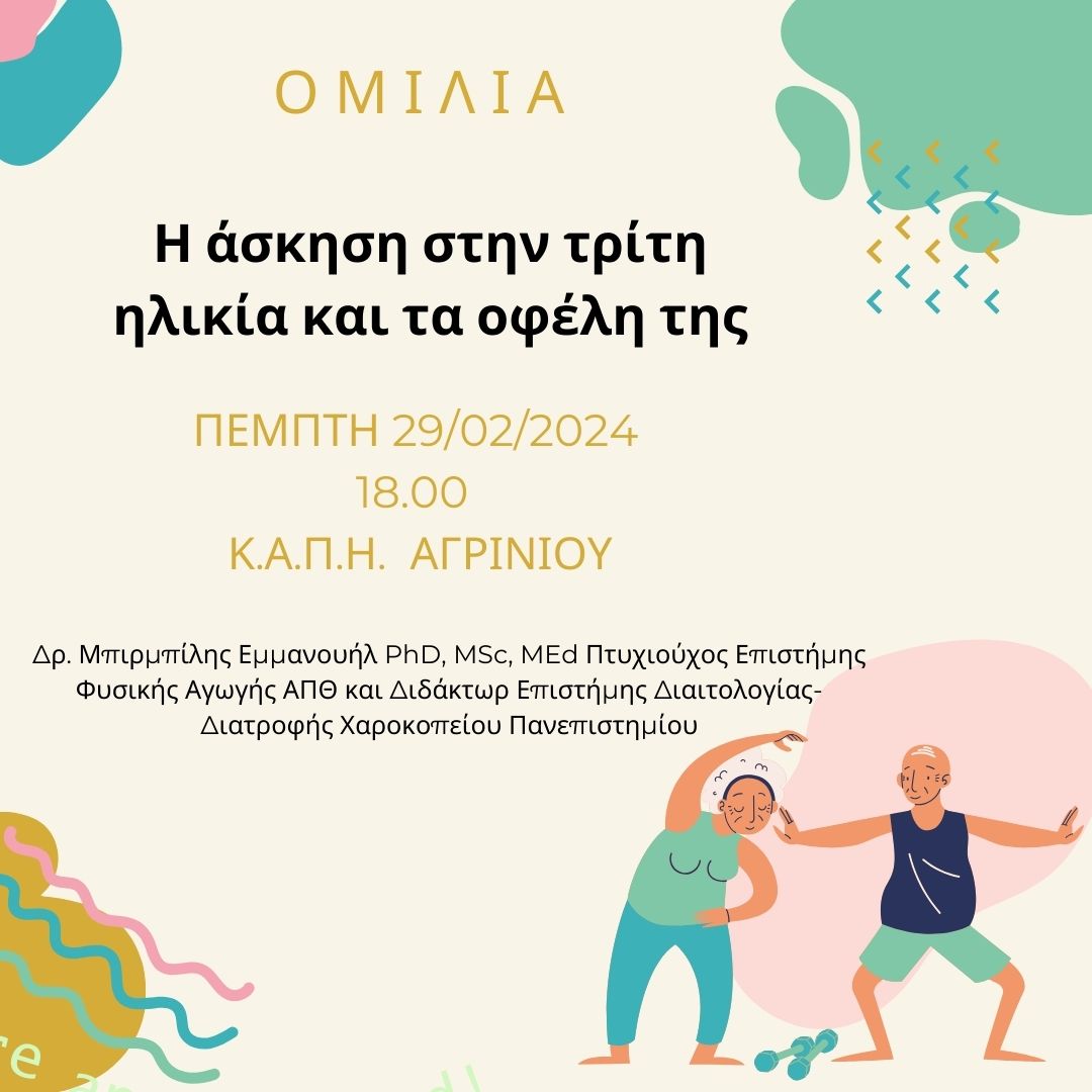 Δύο ομιλίες με θέμα : «Η Άσκηση στην Τρίτη Ηλικία και τα Οφέλη της» θα πραγματοποιήσει ο Δρ. Εμ. Μπιρμπίλης PhD, MSc, MEd Πτυχιούχο Επιστήμης Φυσικής Αγωγής ΑΠΘ και Διδάκτωρ Επιστήμης Διαιτολογίας -Διατροφής Χαροκόπειου Πανεπιστημίου.