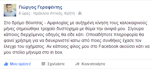 Έκκληση σε όποιον έχει δει κάτι για το θανατηφόρο τροχαίο που σημειώθηκε χθες βράδυ με θύμα την ανηψιά του απευθύνει ο Γιώργος Γεραφέντης μέσα από γνωστή ομάδα κοινωνικής δικτύωσης.