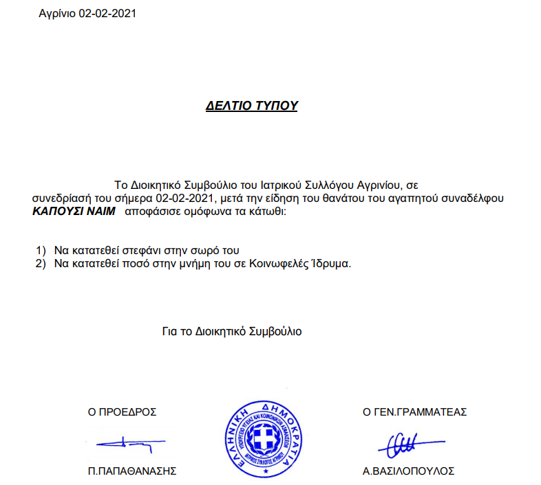 Ο Ιατρικός Σύλλογος Αγρινίου για τον θάνατο του συναδέλφου ΚΑΠΟΥΣΙ ΝΑΙΜ