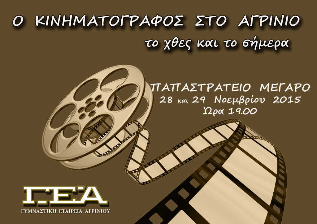 Το Τμήμα Πνευματικών και Καλλιτεχνικών Εκδηλώσεων της Γυμναστικής Εταιρείας Αγρινίου διοργανώνει διήμερη εκδήλωση στις 28 και 29 Νοεμβρίου 2015 στο Παπαστράτειο Μέγαρο, με τίτλο «Ο κινηματογράφος στο Αγρίνιο, το χθες και το σήμερα».