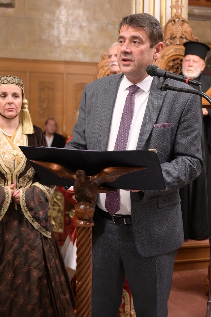 Ο Αρχιερατικός Επίτροπος Αμφιλοχίας Πρωτοπρ. Οδυσσέας Κυρόσιμος μιλώντας εκ μέρους του Ιερού Κλήρου της Αρχιερατικής Περιφέρειας αναφέρθηκε στα ιερά μνημεία, τα ιερά προσκυνήματα και τα Μοναστήρια, με κορυφαίο την Ιερά Μονή Ρέθα, αλλά και στους Αρχιερείς και τους Ιερείς που εργάστηκαν ιεραποστολικά και ποιμαντικά στην ευρύτερη περιοχή του Βάλτου και της Αμφιλοχίας. Εκ μέρους του Ιερού Κλήρου δώρισε στον Σεβασμιώτατο μια ποιμαντορική ράβδο.