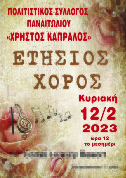 Ο Πολιτιστικός  Σύλλογος  Παναιτωλίου  «Χρήστος  Καπράλος» προσκαλεί  μέλη  και  φίλους  στον Ετήσιο Χορό του που  θα  πραγματοποιηθεί  την Κυριακή,  12  Φεβρουαρίου  2023  στις   12  το  μεσημέρι  στην  αίθουσα  εκδηλώσεων  στο  Corali Luxury Resort, 6o, χλμ Αγρινίου-Αντιρρίου.