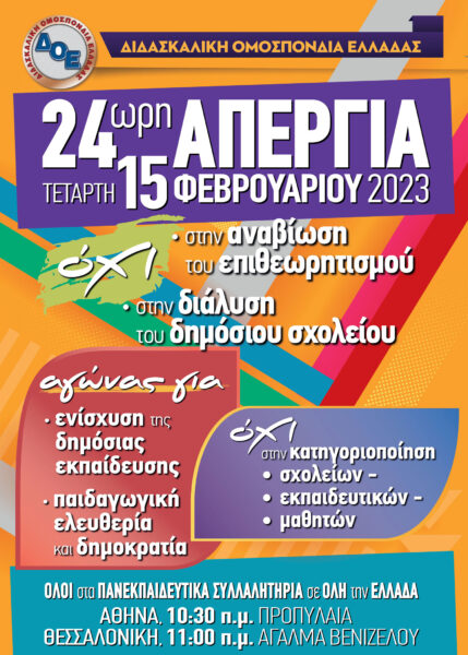– Δευτέρα 13 Φεβρουαρίου: Ολομέλεια των Προέδρων των Συλλόγων Εκπαιδευτικών Πρωτοβάθμιας Εκπαίδευσης στην Αθήνα. Την ίδια ημέρα θα πραγματοποιηθεί διαμαρτυρία στο Υπουργείο Παιδείας, στις 2:00 μ.μ., με την παρουσία όλων των Προέδρων, ενάντια στην αντιεκπαιδευτική αξιολόγηση.