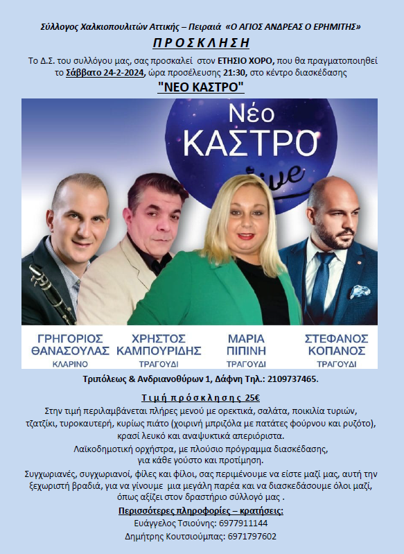Το Δ.Σ. του συλλόγου μας, σας προσκαλεί στον ΕΤΗΣΙΟ ΧΟΡΟ, που θα πραγματοποιηθεί το Σάββατο 24-2-2024, ώρα προσέλευσης 21:30, στο κέντρο διασκέδασης