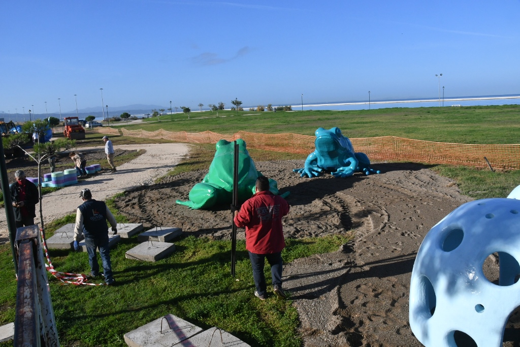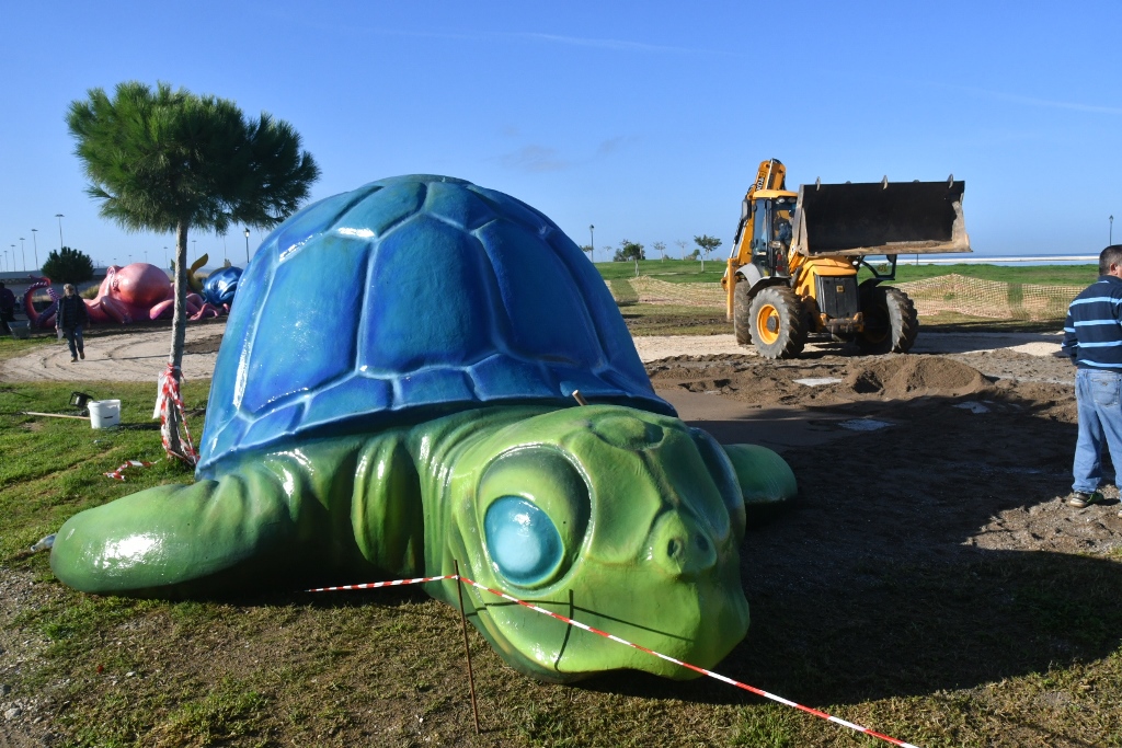 Οι εργασίες βρίσκονται πλέον στο στάδιο της τοποθέτησης των κατασκευών, που απεικονίζουν ζώα της θάλασσας (χελώνα, χταπόδι κ.α.) τις οποίες δημιούργησαν οι εργαζόμενοι του Καρναβαλικού Συνεργείου.