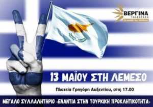 Η Βεργίνα Τηλεόραση, το μεγάλο περιφερειακό κανάλι που κατέγραψε τον παλμό των Ελλήνων από άκρη σε άκρη της γης, οργανώνοντας και μεταδίδοντας αποκλειστικά τα μεγάλα συλλαλητήρια της Θεσσαλονίκης και της Αθήνας κυριολεκτικά σε όλο τον κόσμο, διοργανώνει στις 13 Μαΐου 2018 στη Λεμεσό συλλαλητήριο ενάντια στην τουρκική προκλητικότητα.