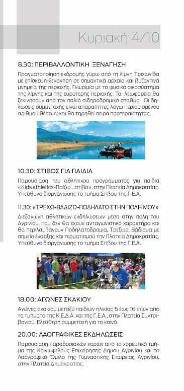11.30: «Τρέχω-βαδίζω-ποδηλατώ στην πόλη μου». Διεξαγωγή αθλητικών εκδηλώσεων μέσα στην πόλη του Αγρινίου, που δεν θα έχουν συναγωνιστικό χαρακτήρα και θα περιλαμβάνουν Ποδηλατοδρομία, Τρέξιμο, Βάδισμα με σημείο έναρξης και τερματισμού την Πλατεία Δημοκρατίας Αγρινίου. Υπεύθυνο διοργάνωσης το τμήμα Στίβου της Γ.Ε.Α.