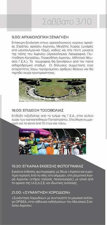 09.00: Επίσκεψη-ξενάγηση στους αρχαιολογικούς χώρους αρχαίας Στράτου, αρχαίου Αγρινίου, Μεγάλης Χώρας (μιναρές από μουσουλμανικό τζαμί), καθώς και στα πέντε μουσεία της πόλης του Αγρινίου (Αρχαιολογικό, Λαογραφικό, Γλυπτοθήκη Καπράλου, Πινακοθήκη Αγρινίου, Αθλητικό Μουσείο Γ.Ε.Α.). Τα λεωφορεία θα ξεκινήσουν από τον παλιό σιδηροδρομικό σταθμό. Οι δηλώσεις συμμετοχής είναι απαραίτητες λόγω περιορισμένου αριθμού θέσεων και θα τηρηθεί σειρά προτεραιότητας.