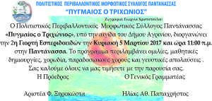 Ο πολιτιστικός Περιβαλλοντικός Μορφωτικός Σύλλογος Παντάνασσας “Πυγμαίος Ο Τριχώνιος” υπό την αιγίδα του Δήμου Αγρινίου διοργανώνει τη δεύτερη Γιορτή Εσπεριδοειδών την Κυριακή 5 Μαρτίου στις 11:00 το πρωί στην Παντάνασσα.
