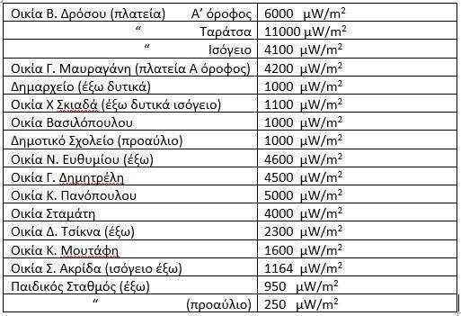 Η ουσία είναι πως όσοι από εμάς μένουμε κοντά στην κεραία αυτή ακούμε ένα συνεχόμενο βουητό. Επίσης το καλύτερο σας το αφήσαμε για το τέλος. Μέτρηση που έγινε σε συγκεκριμένο σημείο πλησίον της πλατείας σε μαγαζί του χωριού έσπασε κάθε ρεκόρ μιας και η τιμές είναι στον πρώτο όροφο 17000 µW/m² και στον δεύτερο 27000 µW/m² . Δηλαδή όπως λέγεται στην γλώσσα τους καζάνι που βράζει.