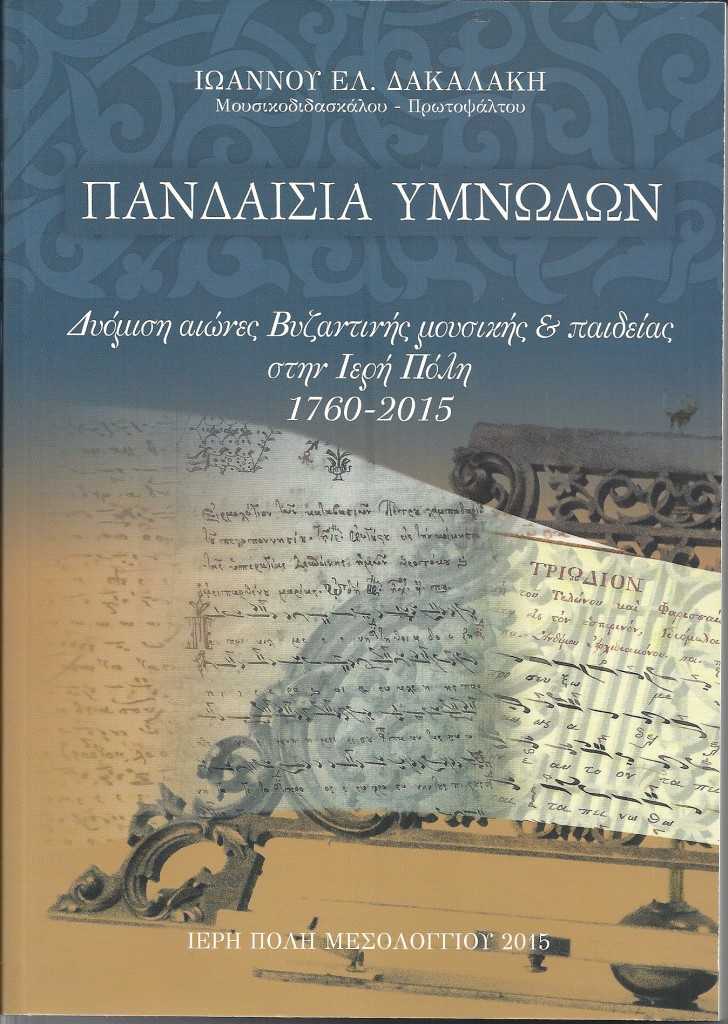 Το νέο βιβλίο του Μουσικοδιδασκάλου και Πρωτοψάλτη κ. Γιάννη Δακαλάκη με τίτλο «ΠΑΝΔΑΙΣΙΑ ΥΜΝΩΔΩΝ – Δυόμιση αιώνες Βυζαντινής μουσικής και παιδείας στην Ιερή Πόλη. 1760 -2015», παρουσιάζεται απόψε το βράδυ στις 8 στο Κέντρο Λόγου και Τέχνης «ΔΙΕΞΟΔΟΣ», στην Ιερή πόλη του Μεσολογγίου.σάρωση0002Πρόκειται για μια πολυετή έρευνα του συγγραφέα πάνω στη διδασκαλία της ελληνικής γλώσσας και της ψαλτικής τέχνης στα χρόνια της Τουρκοκρατίας στο Μεσολόγγι (1760-1821) από τον μεγάλο δάσκαλο Παναγιώτη Παλαμά, τον σημερινό Άγιο Αθανάσιο τον Πάριο, τον εθνομάρτυρα Κοσμά τον Αιτωλό κ.α. Μεγάλο μέρος της νέας του συγγραφικής δουλειάς του είναι αφιερωμένη στον Κληρικό και Πρωτοψάλτη Αρχιδιάκονο Άνθιμο ο οποίος μετά την απελευθέρωση  της Ελλάδος εγκαταστάθηκε  στην Ιερή πόλη του Μεσολογγίου, αφήνοντας μεγάλη παρακαταθήκη στους νεότερους με την εθνική, εκκλησιαστική  και μουσική του δράση και προσφορά.