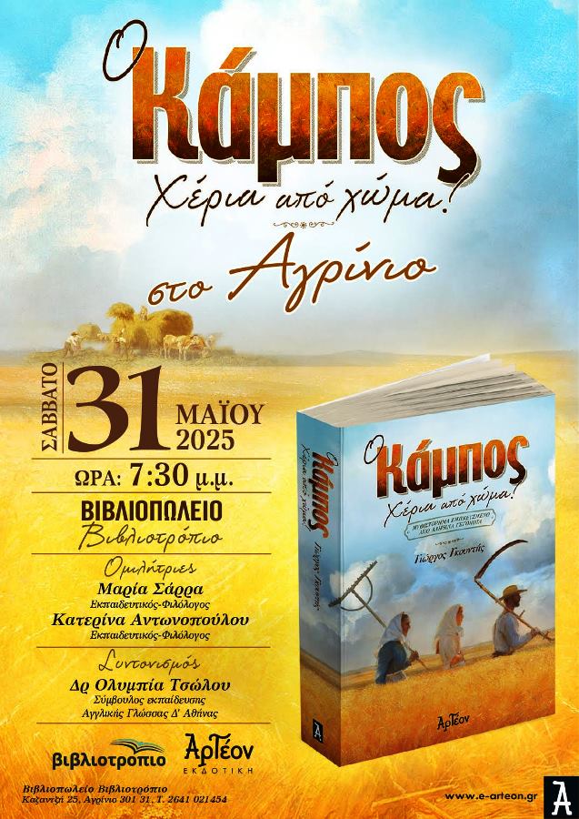 Η Αρτέον Εκδοτική, το βιβλιοπωλείο Βιβλιοτρόπειο και ο συγγραφέας Γιώργος Γκουντής σας προσκαλούν στην παρουσίαση του νέου του μυθιστορήματος “Ο Κάμπος” Χέρια από χώμα το Σάββατο 31 Μαϊου 2025 και ώρα 7:30 μ.μ. στο βιβλιοπωλείο Βιβλιοτρόπιο.