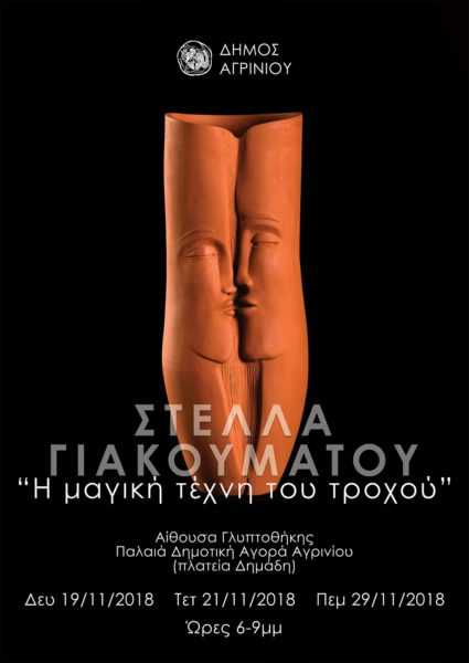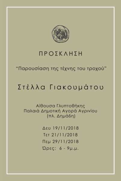 Τη Δευτέρα 19 Νοεμβρίου 2018, και από τις 18:00-21:00, η κεραμίστρια Στέλλα Γιακουμάτου θα παρουσιάσει για πρώτη φορά στο κοινό τη μαγεία της Τέχνης του τροχού στην αίθουσα της Γλυπτοθήκης, στη Παλαιά Δημοτική Αγορά Αγρινίου (πλ. Δημάδη).