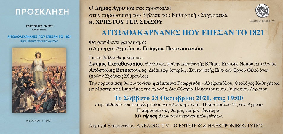 Ο Δήμος Αγρινίου διοργανώνει την παρουσίαση του βιβλίου του Καθηγητή – Συγγραφέα κ.Χρήστου Γερ. Σιάσου ΑΙΤΩΛΟΑΚΑΡΝΑΝΕΣ ΠΟΥ ΕΠΕΣΑΝ ΤΟ 1821 το Σάββατο 23 Οκτωβρίου 2021, στις 19:00 στην αίθουσα του Επιμελητηρίου Αιτωλοακαρνανίας, Παπαστράτου 53, Αγρίνιο.