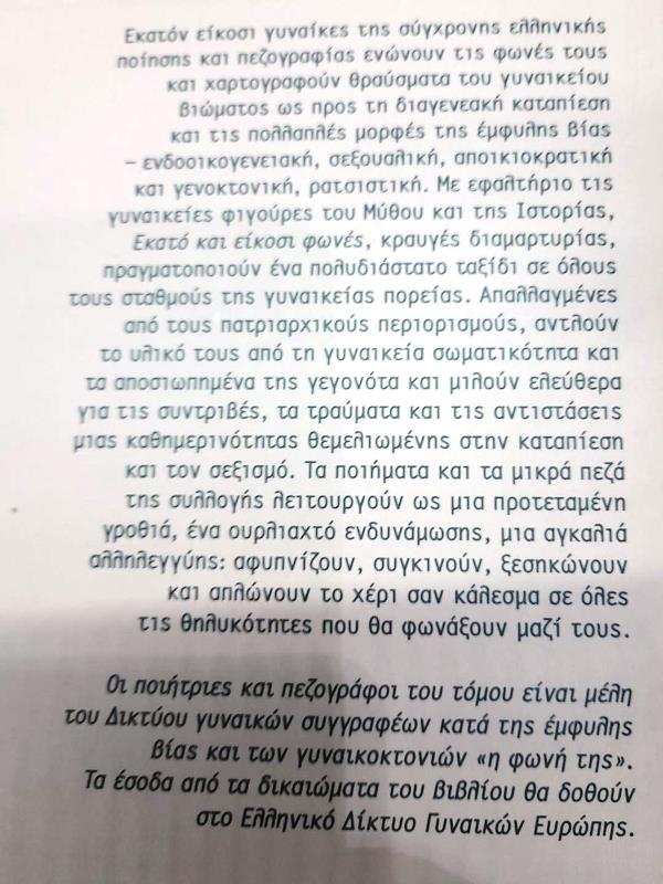 Το βιβλίο περιλαμβάνει ποιήματα και μικρά πεζά 120 γυναικών συγγραφέων, που ενώνουν τις φωνές τους κατά των γυναικοκτονιών και της έμφυλης βίας.