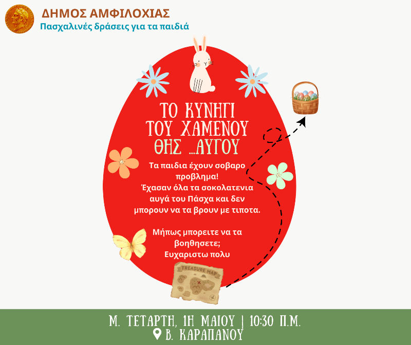 Πασχαλινές δράσεις για παιδιά διοργανώνει ο Δήμος Αμφιλοχίας τη Μεγάλη Τετάρτη που φέτος είναι και η μέρα της Πρωτομαγιάς, με τις γειτονιές της Αμφιλοχίας να γεμίζουν χρώματα και παιδικές φωνές εν όψει της μεγάλης γιορτής του Πάσχα.