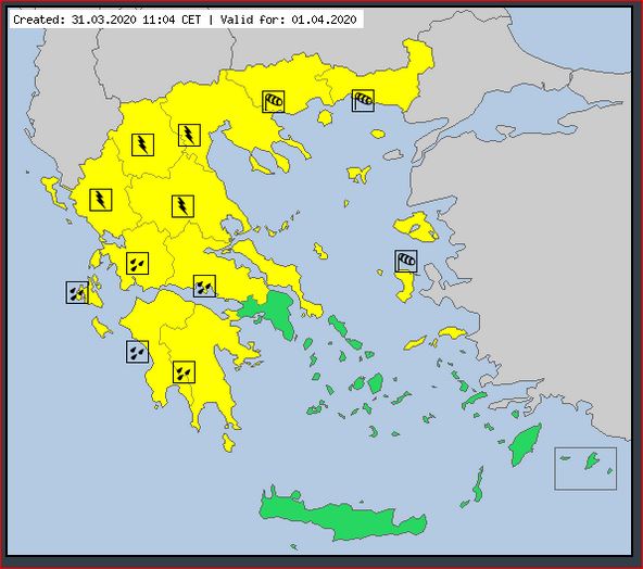 β. Οι βροχές που θα εκδηλώνονται στη Μακεδονία από τις πρωινές ώρες της Τετάρτης, γρήγορα θα ενταθούν και θα είναι ισχυρές, ιδιαιτέρως στην κεντρική Μακεδονία. Από τις βραδινές ώρες ισχυρές βροχές και σποραδικές καταιγίδες θα επηρεάσουν τη Θράκη, τα νησιά του βορείου Αιγαίου και από τις πρώτες πρωινές ώρες της Πέμπτης (02-04-2020) τα νησιά του ανατολικού Αιγαίου και πιθανώς τα Δωδεκάνησα.