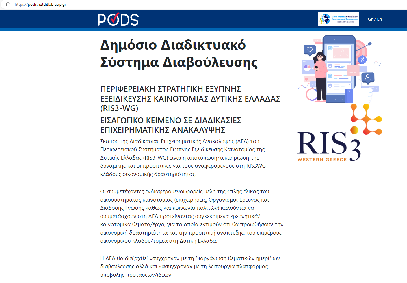 Τα μέλη της τετραπλής έλικας του οικοσυστήματος καινοτομίας στην Περιφέρεια Δυτικής Ελλάδας (επιχειρήσεις, Οργανισμοί Έρευνας και Διάδοσης Γνώσης καθώς και κοινωνία πολιτών) έχουν τη δυνατότητα να συμμετάσχουν στη Διαδικασία Επιχειρηματικής Ανακάλυψης μέσω της Ασύγχρονης Πλατφόρμας Διαβούλευσης για την υποβολή και καταγραφή των ιδεών ή προτάσεων που αφορούν έργα έρευνας ή καινοτομίας που θα μπορούσαν να αποτελέσουν αντικείμενο ενίσχυσης στο πλαίσιο της Στρατηγικής Έξυπνης Εξειδίκευσης (RIS3) Δυτικής Ελλάδας για την προγραμματική περίοδο 2021-2027.
