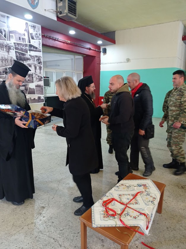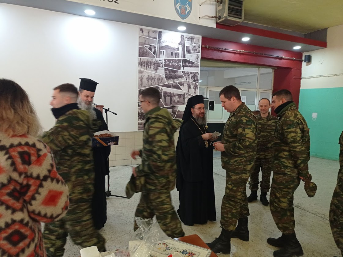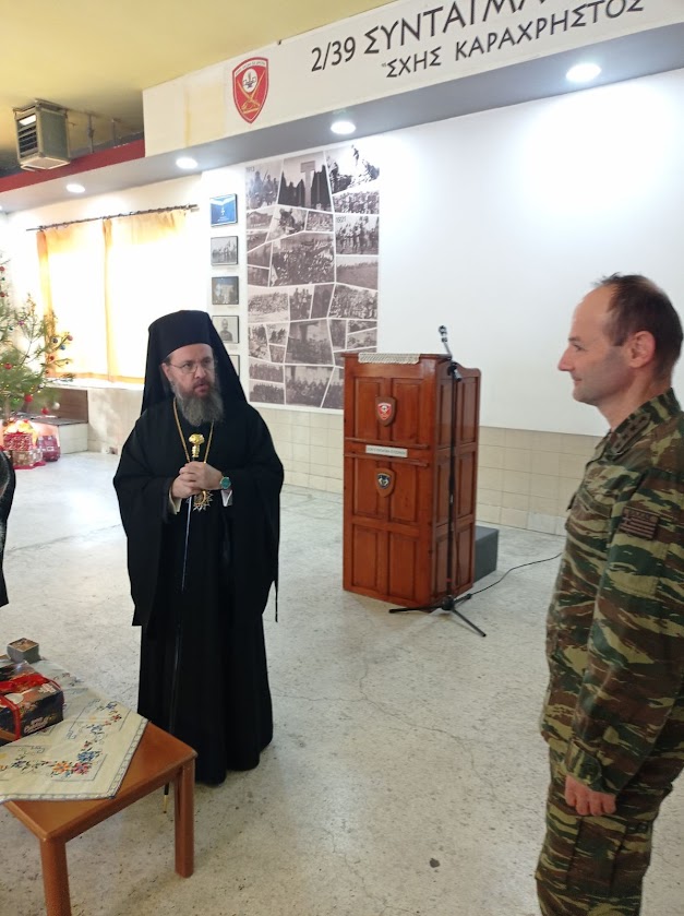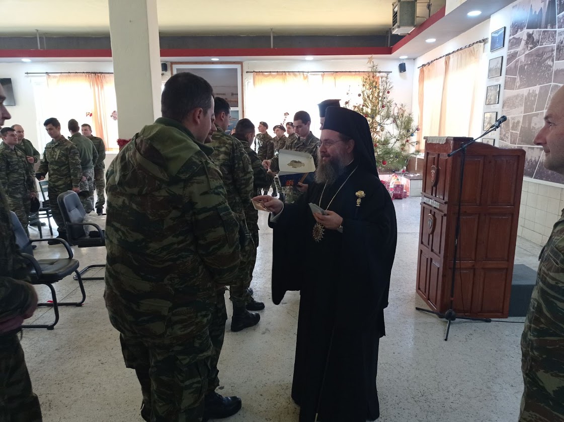 Ο Σεβασμιώτατος μίλησε στους Αξιωματικούς και τους Οπλίτες για το βαθύτερο νόημα της εορτής των Χριστουγέννων και τους ευχήθηκε για τις ημέρες του Αγίου Δωδεκαημέρου. Αναφέρθηκε επίσης στην παράδοση και την ιστορία του τόπου και της Ιεράς Μητροπόλεως.