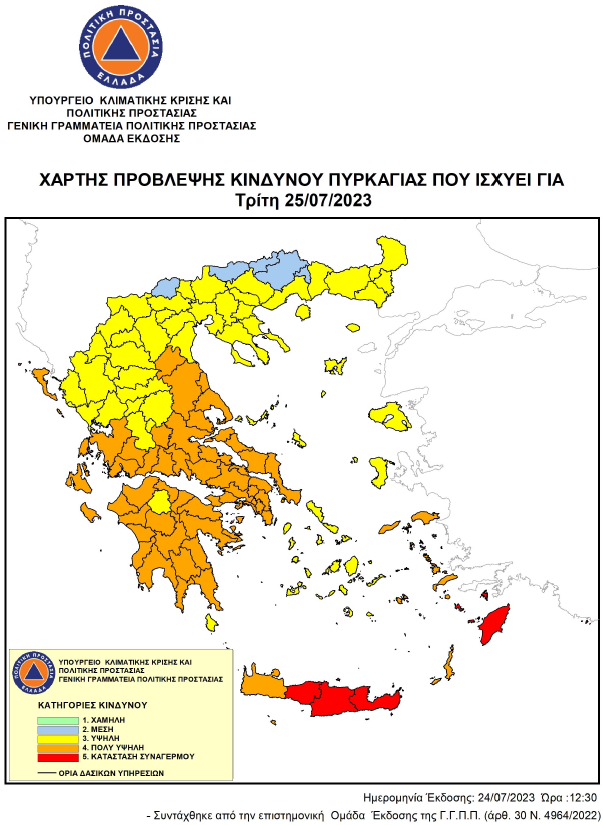 Σύμφωνα με την πρόβλεψη της Γενικής Γραμματείας Πολιτικής Προστασίας οι Π.Ε. Αχαΐας, Ηλείας, Αιτωλοακαρνανίας, θα βρίσκονται στην κατηγορία 4 (πολύ υψηλή) σε σχέση με τον κίνδυνο πρόκλησης πυρκαγιάς, για την Τετάρτη 25 Ιουλίου 2023, όπως φαίνεται στον επισυναπτόμενο ημερήσιο Χάρτη Πρόβλεψης Κινδύνου Πυρκαγιάς.
